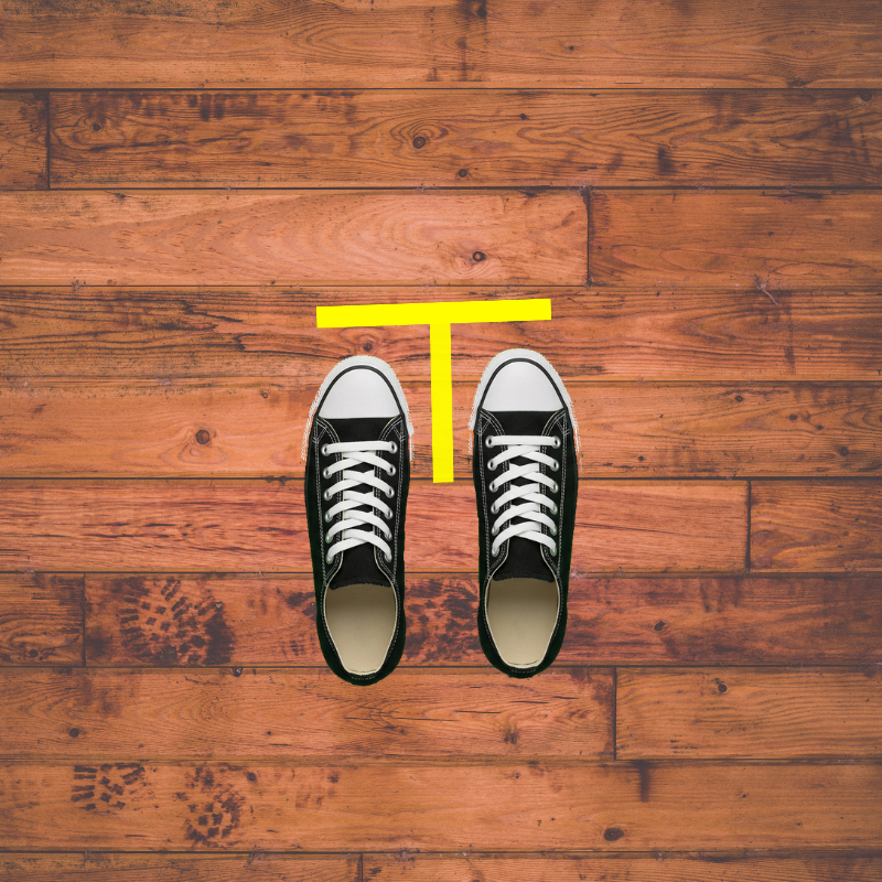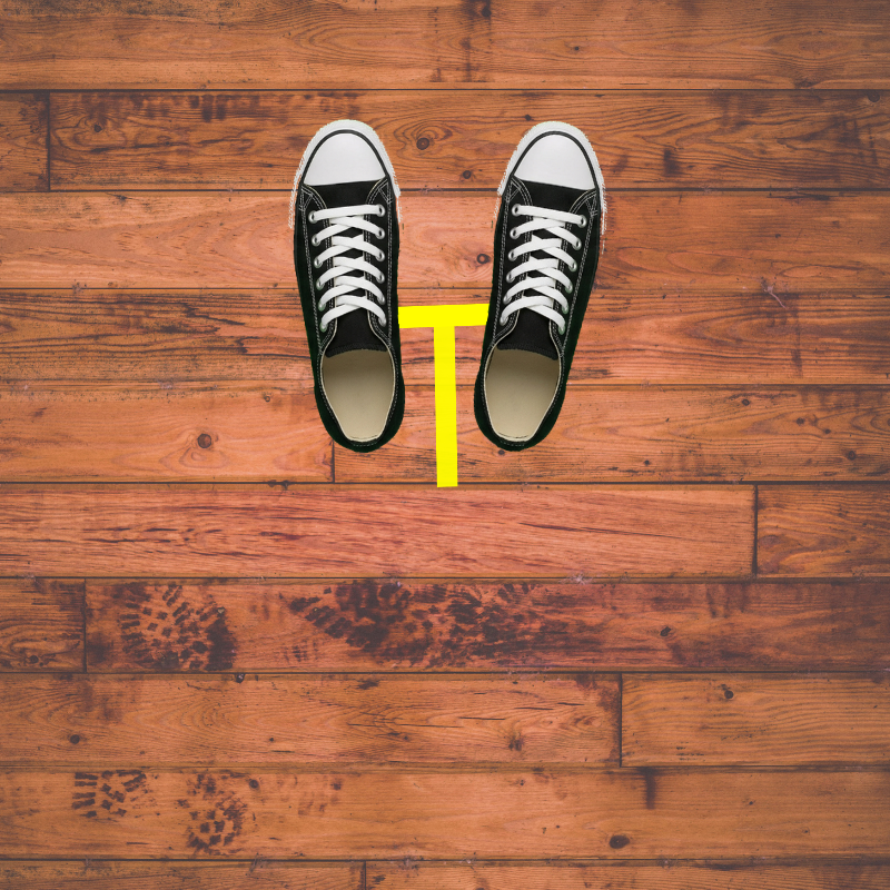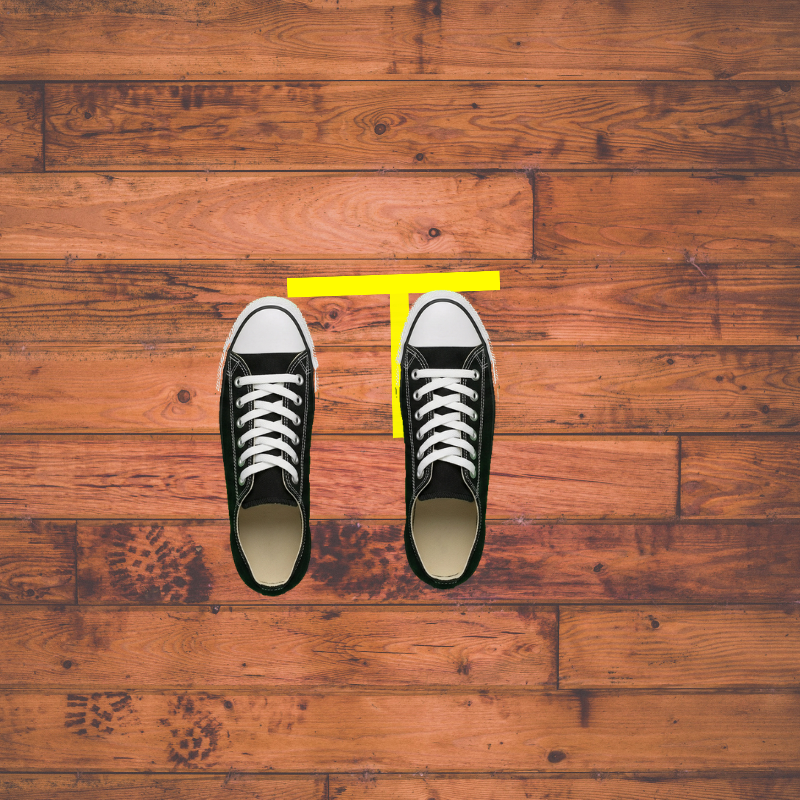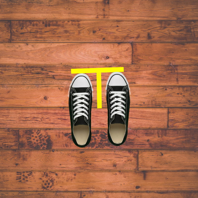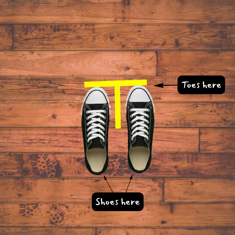 Next, you want your toes to touch the underside of the crossbar of the T. (The crossbar is the horizontal piece of tape.)