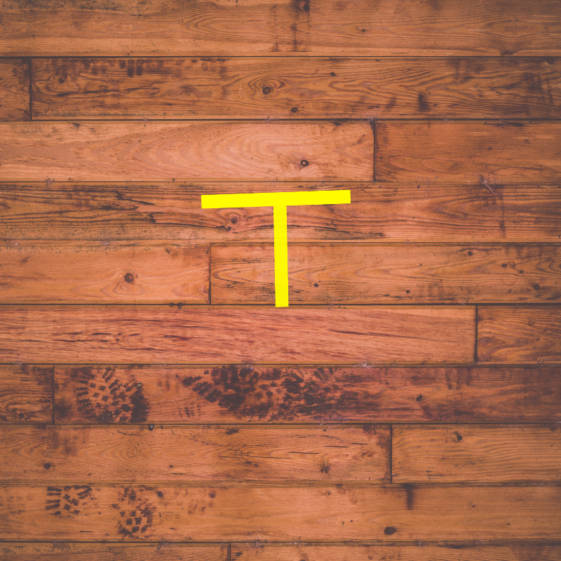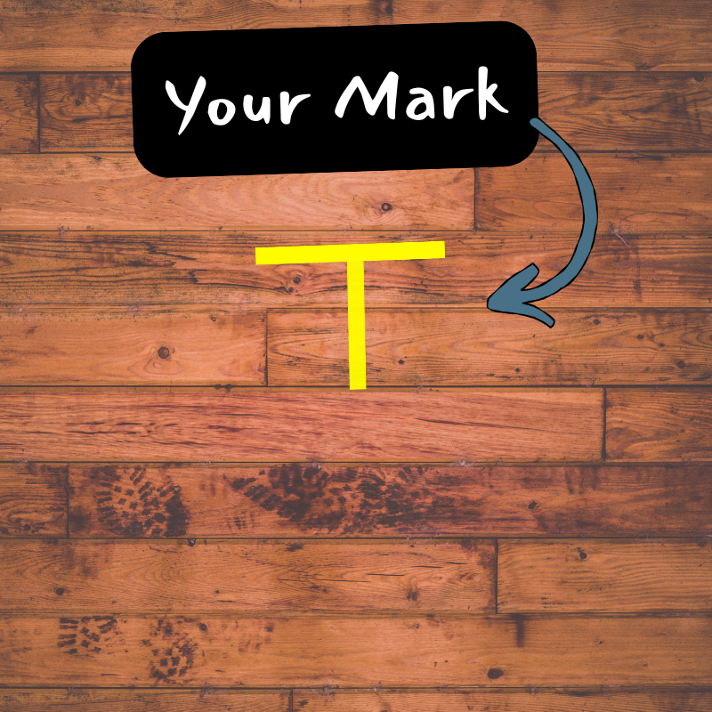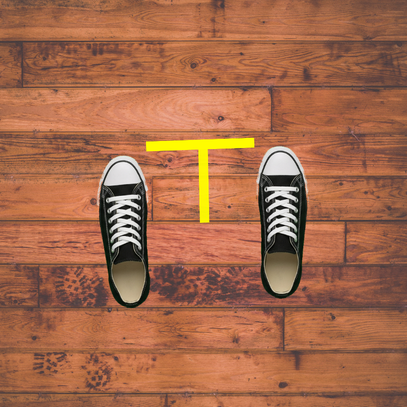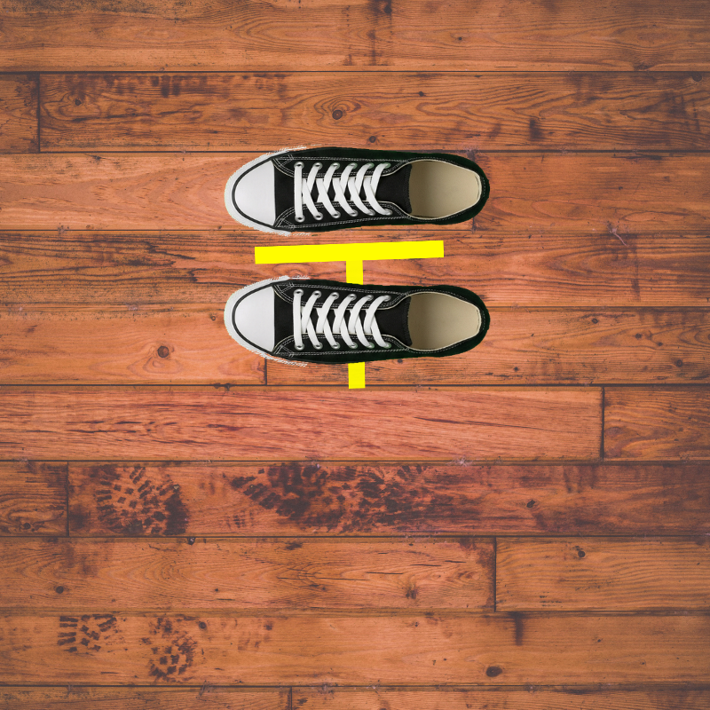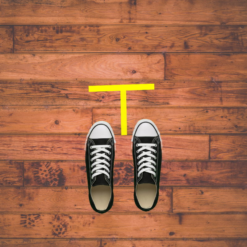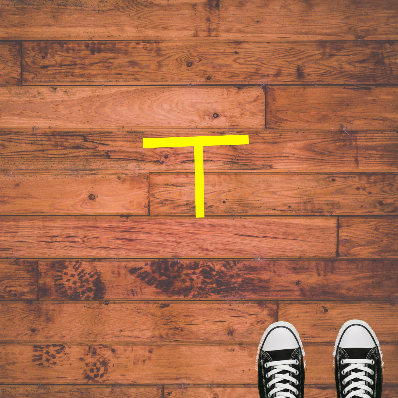 Next, you want your toes to touch the underside of the crossbar of the T. (The crossbar is the horizontal piece of tape.)
